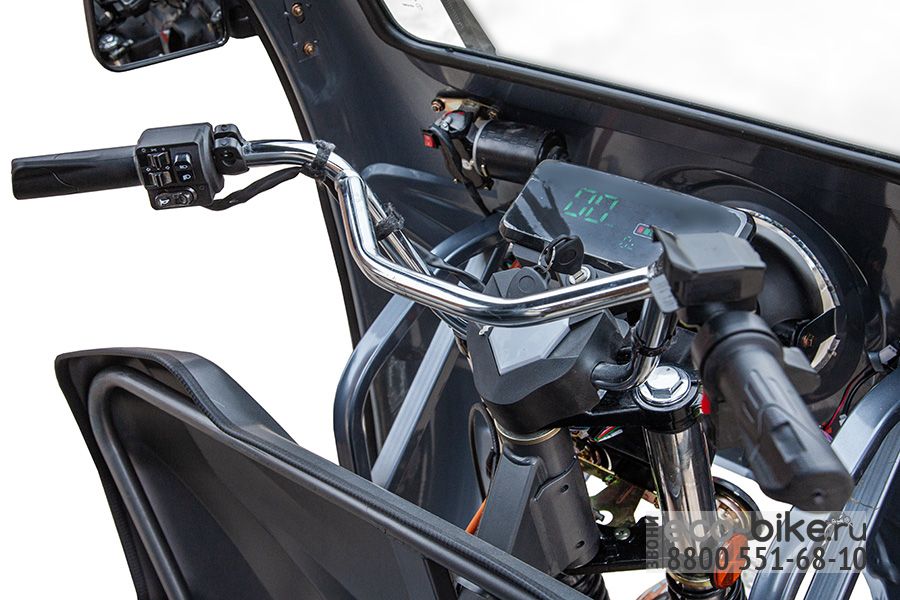 На трицикле штатно установлена противоугонная сигнализация и современная цифровая приборная панель, а передний и задний тормоза приводятся в действие гидравликой при нажатии на педаль.